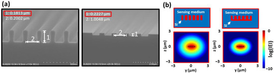 In Figure 5 and Figure 7, the effects of the shape deformation of the pillars and periodic structures of the sensors were discussed to give the deviation of the optimal structures designed for high performances, and the experimentally obtained sensitivity that was higher than the simulated one was explained from the shape deformation from rectangular to round shapes after the fabrication leading to the effective increase of OSCF. This deformation possibly originated from EB lithography, such as lift-off or inverse exposure techniques, and was related to the SW BG formation process by etching to silicon waveguides with EB resist or metal masks. The EB resist patterns that were formed critically depended on EB dose and development time, which is known as the so-called proximity effect where for smaller exposed areas actual exposure tends to be weaker [43]. To avoid this, a +5 s time adjustment in ZED-50 development and a +10 nm additional etching time were taken into account. During the etching process, there was a lag effect for smaller exposed areas whereby the WG inner etching region was not fully etched. The example of this lag effect is shown in Figure 11a, which shows the etched silicon gratings for two different periods of 200 nm and 1000 nm and with almost the same etching depth for around 220 nm. The actual etched depth was smaller for the smaller period grating, resulting in insufficient etching in some cases. The simulated TE mode profiles are shown in Figure 11b for the non-fully etched and the fully etched multi-slot structures in this case, indicating the larger TE mode confinement in the slot regions for the non-fully etched case. This lag effect also affects the grating duty ration, and these results suggest that the fabrication process should be undertaken with great attention paid to the designed structures in MS-SW BG sensors.