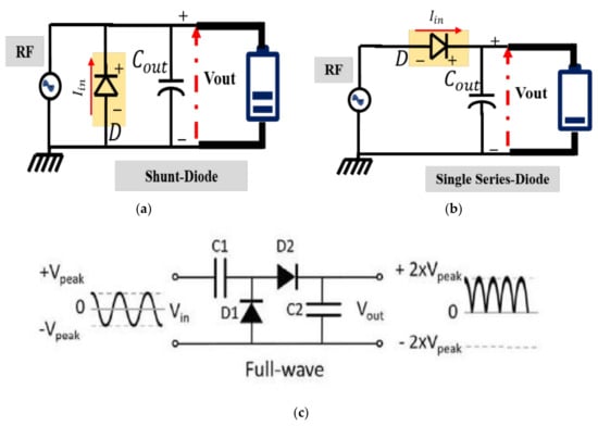 - Hamzi, I.; El Bakkali, M.; Aghoutane, M.; Touhami, N.A. Analysis of Series and Shunt Rectifier Circuits Topologies. In Proceedings of the 2019 International Conference on Wireless Technologies, Embedded and Intelligent Systems (WITS), Fez, Morocco, 3–4 April 2019; pp. 1–4. [Google Scholar] [CrossRef]