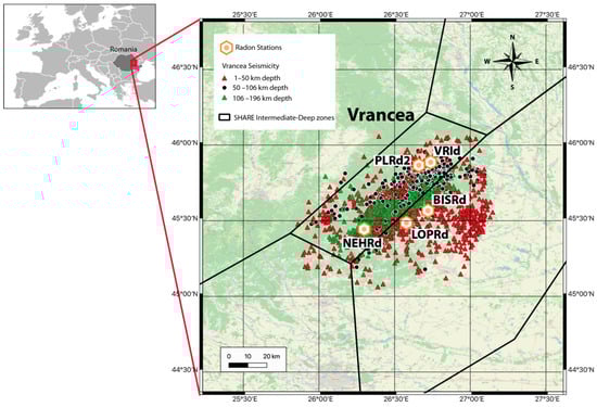 Seismicity in the Vrancea region (Romania) from July 2015 to August 2020. The SHARE intermediate-deep seismic zone [23,24] and the location of the radon stations are also represented.
