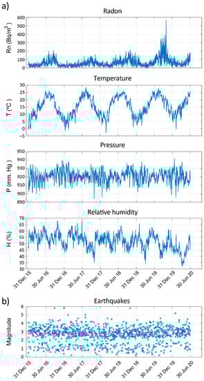 For the present study, the measurements taken at the BISRd station have been used, as it is located in the most central part of the Vrancea zone and covers a longer period of time without gaps, spikes, or corrupted data. The station is installed inside a place made with brick walls. In Figure 2, radon, temperature, pressure, and relative humidity measurements are shown for the BISRd station for the period between 31 December 2015 and 30 June 2020. Additionally, the earthquakes registered during this period are also shown. As can be observed, seismicity in this region occurs almost daily.