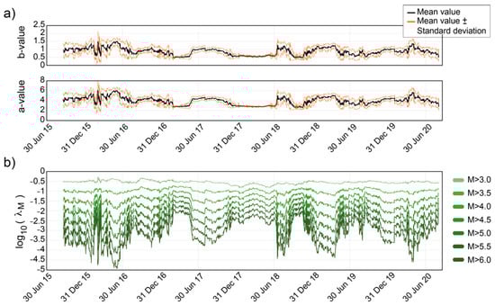 Thus, in the present work, the continuous GR parameter time series, a and b, have been computed from the Vrancea full catalogue (from July 2015 to September 2020) using the methodology explained earlier (Figure 3a). Subsequently, these values have been used to obtain for different threshold magnitudes, M (Figure 3b).