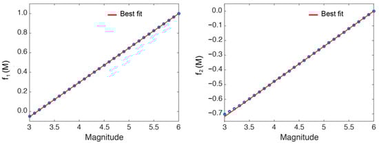 In Figure 4, the and values obtained for different magnitudes are shown. It can be observed how the slope and the y-intercept estimated for the different magnitudes between 3.0 and 6.0 follow a linear behaviour, at least from 3.5 onwards.