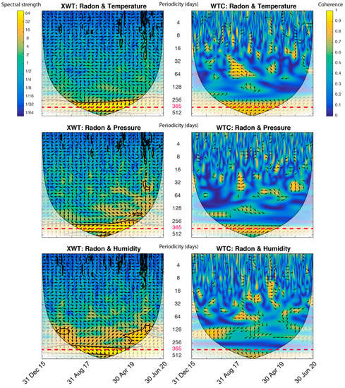 XWT and WTC performed in pair of signals: Radon—temperature; radon—pressure; and radon—relative humidity. The bottom axis is time. Spectral strength is shown by colours ranging from blue (weak) to yellow (strong). The central vertical axis indicates periodicities (days). The relative phase relationship is shown as arrows (with in-phase pointing right, anti-phase pointing left, and one signal leading the other by 90° pointing straight down) and can be also interpreted as a lead/lag of one signal in relation to the other.