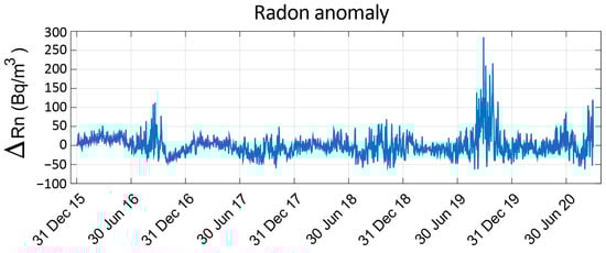 In the present work, the 1-year oscillations, as well as any possible linear trends, have been identified by using cubic-spline interpolation [27]. In Figure 6, the radon anomaly that corresponds to the subtraction of the seasonal behaviour from the radon time series is shown.