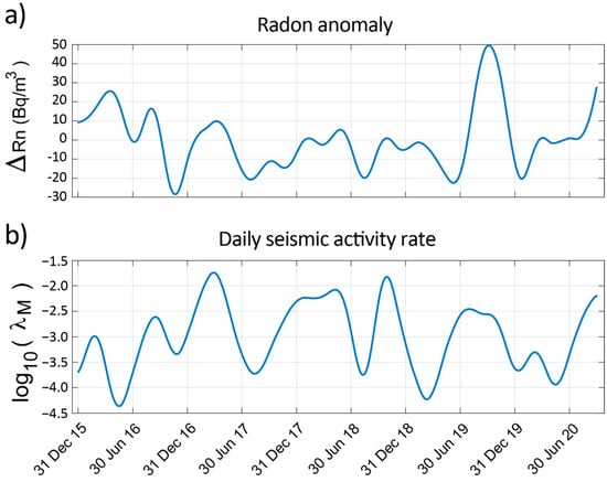 where Rn corresponds to the approximation coefficients obtained in Section 4.3 for the radon anomaly. For the study site, this relation provides insights into the behaviour of the daily seismic activity rate from the radon measurements. We must remember that this is not an exact relationship between both signals as a radon anomaly might be affected by other additional factors.