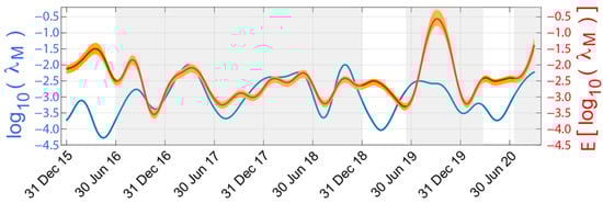 In order to study the robustness of the proposed approach, the STC analysis has been applied to 100 2-year intervals, arbitrarily selected from the entire series. In Figure 8, the comparison between the expected daily seismic activity rate, i.e., , and the predicted one from the radon anomaly, i.e., , is shown.