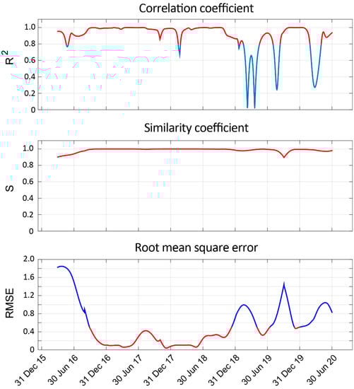 As explained in Section 3.4, three different metrics have been used to evaluate the performance of the STC approach: the correlation coefficient, the similarity coefficient, and the root mean square error. In Figure 9, the results estimated for each day of analysis are shown. In this case, the complete time series have been analysed.