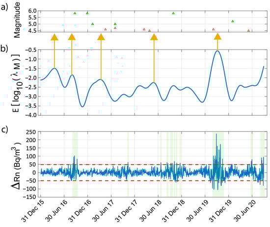 In Figure 10c, the sum of the wavelet coefficients of the radon anomaly are also shown (see Section 4.3). In addition, two dashed red lines are included, which indicate 2 the standard deviation. According to other authors (e.g., [3,8,12,13,14,15]), a positive deviation that exceeds the mean radon level by more than twice the standard deviation might be indicative of incoming earthquakes. In the present study some deviations of this type can be observed that occur a few days/weeks before some of the earthquakes with magnitudes above 5.0 (see green shadow areas).