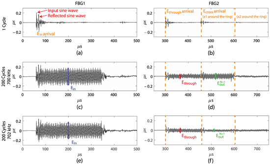 Initial experiments were performed with standard single-mode fiber as the ring and a 700 kHz and 702 kHz excitation signal. Figure 4a–f show the recorded signals at FBG1 and FBG2 for these experiments. Figure 4a shows measured by FBG1 for 1 cycle of the sine-wave input. At around 60 μs, we observed the input sine wave, and after approximately 10 μs we observed a second sine wave, which is a reflection that is possibly caused by the wave traversing through the nylon block. Figure 4b shows the FBG2 reading for the same excitation, with the waves and after the first pass through the ring, and after the second pass through the ring. The theoretical arrival time for each signal is marked in Figure 4b, confirming the identification of each wave. As the velocities of the acoustic modes are much slower than the optical light waves in optical fibers, the separation time is visible in the measurements and is much larger than the burst duration. Therefore, no interference occurs between and the multiple . In addition, we can see the actual waveform in the signals. However, from this experiment, we observed that the amplitude of after the second pass through the ring is small compared to the other wave packets; therefore, we only considered after the first pass in the subsequent experiments. This rapid decay is due to the loss in the coupler and the propagating loss in the fiber ring, which are both significant for these experiments.