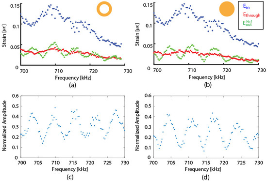 Figure 5a,b plot the peak-to-peak amplitude measurements of , , and as a function of the input frequency . Figure 5a shows the result for the 75 μm hollow-core fiber, while Figure 5b shows the result for the standard 125-μm single-mode solid fiber. Between the two experiments, the ring was removed, and the standard single-mode fiber ring was attached to the main optical fiber. Therefore, the coupling to the broadband transducer and remained the same. The amplitude of varied with frequency because the output amplitude from the broadband transducer varied; the wave coupling can vary with the frequency at the transducer to the nylon block interface and at the nylon block to the main fiber interface. Based on these data sets, we examined the wave interference pattern, as shown in Figure 5c,d in which the interference pattern is normalized with .