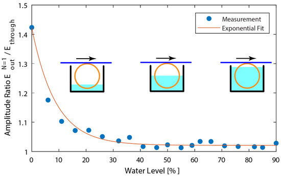 where Lw is the length of the fiber that is submerged in water. Figure 6 shows the measured interference pattern for water levels from 0% to 90%, along with an exponential curve fitted to the data. The output is normalized to , so that the value of 1 corresponds to there being no energy remaining after the wave travels around the fiber ring. As the water level increased, the amplitude of reduced rapidly; thus, the amplitude ratio decreased, as expected. The sensor output was saturated when approximately 40% of the ring was submerged, confirming that the attenuation in water is considerably higher than that in air.