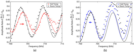 Wave interference pattern and fitted curves from 700 kHz to 715 kHz: (a) at room temperature and the hot temperature, and (b) at room temperature and the cold temperature.