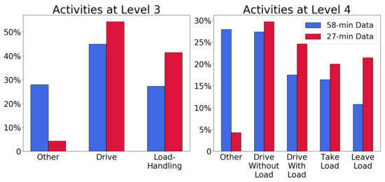 A forklift expert manually labeled each second of the two videos from the Swedish site by interpreting the drivers’ actions. This labeling was performed according to Level 4 in Figure 1. Figure 2 shows a comparison of the labeling on Levels 3 and 4 in these two datasets. Their distributions differ regarding the other category because the 27-min dataset does not reflect normal operation, while the 58-min dataset does. The other activity corresponds, e.g., to picking up orders and waiting for crossing traffic, which occurs very rarely in the shorter dataset. Despite this difference, the 58-min dataset was selected as the training set and the 27-min dataset for out-of-sample testing.