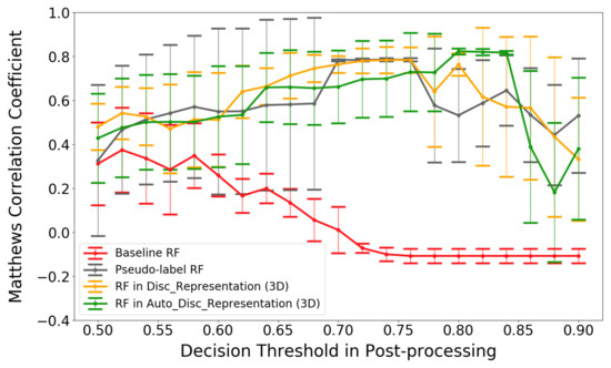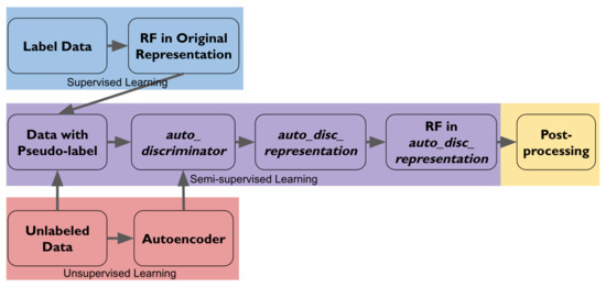 For testing the performance of the proposed method in terms of semi-supervised feature learning, post-processing was also applied to three other classifiers, i.e., the first three columns in Table 3. Except for the baseline RF, another RF classifier is trained with the pseudo-labeled large data set, namely the pseudo-label RF, and it is significantly different from the baseline RF that supplies the pseudo-labels. One more RF, an RF on top of disc_representation, is trained on top of a multi-layer perceptron (MLP). This MLP has the same network structure as auto_discriminator and is trained directly from the pseudo-labeled data without first training an autoencoder.