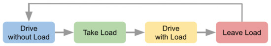 The logical order of forklift activities. Some papers [5,19] refer to this as “working cycles” of equipment.