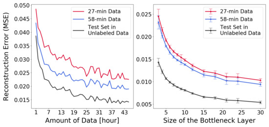 Autoencoders were trained using unlabeled data from the Norway warehouse. The reconstruction error, when evaluated on hold-out test data, decreased when the amount of training data increased or when the number of bottleneck units increased. The behavior was essentially the same for data from the Norway and Sweden sites (see Figure 5). All networks in the right panel of Figure 5 were trained with 25 h of unlabeled data, and the autoencoders in the left panel all used three units in the bottleneck layer. The result shows that the low-dimensional manifolds where the data reside appear to be very similar between the Norway and the Sweden data sets, indicating that SSL should be applicable, since this is a requirement listed by Chapelle et al. [14]. Furthermore, being able to use much more data made a significant difference: an autoencoder trained with a large amount of unlabeled data from Norway was actually better at reconstructing the Swedish data than an autoencoder trained on all the available Swedish data itself.