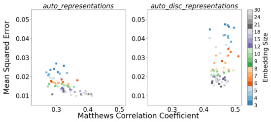 Comparison between recognition performances (in MCC) and reconstruction performances (in MSE) using (left panel) the auto_representations and (right panel) the auto_disc_representations.