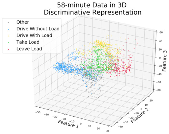 Figure 7 shows a visualization in the three-dimensional auto_disc_representation of the 58-min labeled data with Level 4 activity labels. The activities are quite well separated and the relationships between them are visible, e.g., other intersects with drive without load, take load is close to leave load, and so on.