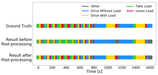Figure 9 illustrates the activity recognition results on the 27-min hold-out test set with and without post-processing. The activity recognition with the auto_disc_representation is quite good in itself but has problems with separating take load and leave load, and with detecting drive with load for light loads. The post-processing steps fix these confusions, and an “invisible load” is detected in a driving activity that occurs after about 1000 s. The load sensor is not sensitive enough to detect a load on the forks, but the activity recognition algorithm figures this out from the context, i.e., the prior recognized activities. Similar detection of “invisible loads” is also observed in the unlabeled data set, but no ground truth is available to verify their correctness.