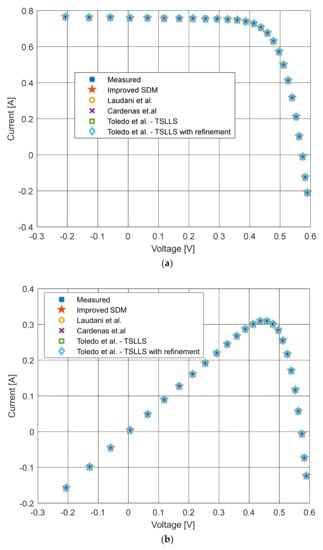 - Javier Toledo, F.; Blanes, J.M.; Galiano, V. Two-Step Linear Least-Squares Method for Photovoltaic Single-Diode Model Parameters Extraction. IEEE Trans. Ind. Electron. 2018, 65, 6301–6308. [Google Scholar] [CrossRef]