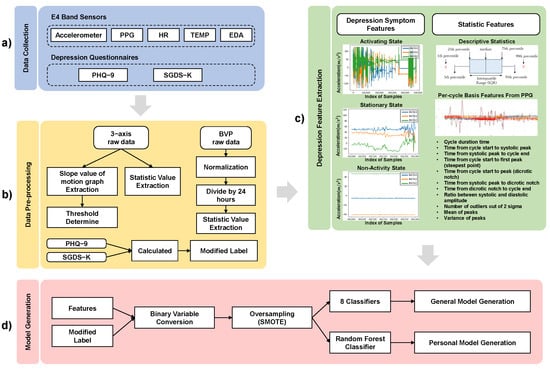 As the first step, the sensing data from the E4 wearable band and the depression questionnaire data are collected as shown in Figure 1. The E4 band has PPG, ACC, EDA, and temperature sensors (TEMP). Depression questionnaire data is the score of PHQ-9 questionnaire and the SGDS-K questionnaire. Numerical scores are mapped to extracted features as labels.