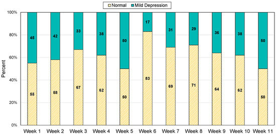 The models we proposed predict whether the participant is in a normal state or a mild depression. The depressed mood is classified based on Formula (1). We go through several experiences to find out the threshold value of classifying the depressed mood states. The achieved threshold value has the highest accuracy, f1-score, and recall value for all the participants. The value of k that derives the best results is 0.5, and when the corresponding threshold is set, normal and mild depression are present in a ratio of approximately 2:1. Figure 2 is a graph showing weekly ratio of participants in the two classes. The weekly ratio of normal and mild depression for all participants is 1.9:1 in average.