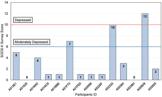 The SGDS-K consists of 15 questions, and the answers are yes and no, and if yes, 1 point is counted. The highest score is 15, and if the score is 6 or higher, consultation with a specialist is recommended. Through the results of the SGDS-K, it is possible to examine whether the proportions of depressed, normal, and mild depression among all the participants are evenly distributed. PHQ-9 is composed of 9 items that correspond to the diagnostic criteria for major depressive disorders in DSM-5 (Diagnostic and Statistical Manual of Mental Disorders). The total score of the PHQ-9 is used for evaluating the severity of depression. It ranges from 0–27 points, reflecting the higher the severity of depression as the score increases [48,49].