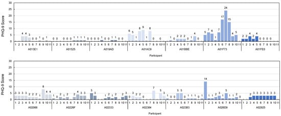 PHQ-9 is performed on all the participants once a week for about 10 weeks. The survey is conducted every Wednesday and Friday. As shown in the Figure 4, the largest variation of individual weekly scores is 23 points. In this case, there is an obituary of the participant’s brother during the experiment period. When this patient conducts the PHQ-9 after the funeral, the total score is 24. This score is the highest score among all survey results. This score can be interpreted as severe depression. The person with the next greatest change has a difference of 14 points. The participant frequently mentioned concerns about his son, especially during the experiment. This participant’s highest PHQ-9 score is 14, which could be diagnosed as severe depression. The third most varied person has a 9-point difference. This participant suffers from health problems such as dental care and back pain during the experiment period.