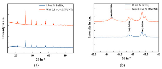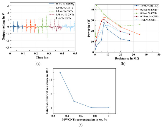 - Yan, J.; Jeong, Y.G. Roles of carbon nanotube and BaTiO3 nanofiber in the electrical, dielectric and piezoelectric properties of flexible nanocomposite generators. Compos Sci Technol. 2017, 144, 1–10. [Google Scholar] [CrossRef]