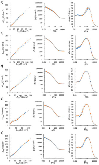 Electrochemical impedance spectroscopy measurements (three colors; three replicates) of differently treated electrodes in the solution of 10 mM K3[Fe(CN)6] and 0.1 M KCl. (a) Pristine electrode; (b) negative-plasma-treated electrode; (c) positive-plasma-treated electrode; (d) H2O2-treated electrode; (e) H2SO4-treated electrode.