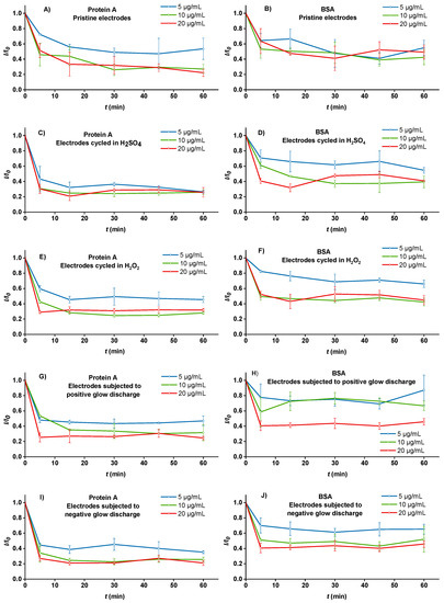 The kinetics of protein A (A,C,E,G,I) and BSA (B,D,F,H,J) adsorption at different concentrations (5, 10, and 20 µg mL−1) to differently preconditioned SPEs. (A,B) Pristine electrodes (no preconditioning); (C,D) H2SO4-treated electrodes; (E,F) H2O2-treated electrodes; (G,H) positive-plasma-treated electrodes; (I,J) negative-plasma-treated electrodes. The signal attenuation due to protein adsorption was calculated as I/I0, where I is the square-wave voltametric peak current after and I0 before adsorption at the same electrode recorded in a 1 mM + 1 mM mixture of K3[Fe(CN)6] and K4[Fe(CN)6] in 0.1 M KCl. Each time-point is an average of three different electrodes; error bars denote standard deviations.