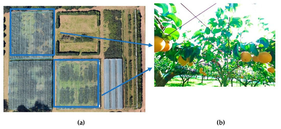Aerial view of orchards for data collection located at the Tsukuba-Plant Innovation Research Center (T-PIRC), University of Tsukuba, Tsukuba, Ibaraki. (a) satellite view of Tsukuba-Plant Innovation Research Center (T-PIRC); (b) the view of pear orchard in T-PIRC.