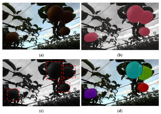 Different segmentation in pear detection using 3D camera datasets, (a) original image; (b) semantic segmentation; (c) object detection and (d) instance segmentation.