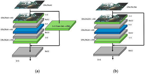 The inner structure of ResNet101 as an example of second layers (C2): (a) is conv block and (b) is identity block. The images which were inputted into the ResNet have changed the channels. Conv block is the first stage of each layer, and the identity blocks and conv blocks were combined to the ResNet.