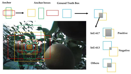 The positive and negative classes for network training were established by the generated anchors and 256 were selected according to intersection-over-union (IoU) [12] for training the RPN, of which, 128 positive samples (foreground) and 128 negative samples (background) were guaranteed. This step was performed to calibrate the anchor box, in addition to calculating the offset between the anchor box and the ground truth (Figure 7).