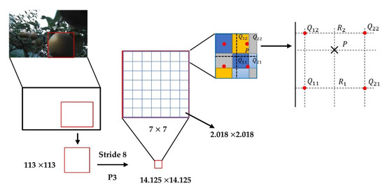 Bilinear interpolation in ROI-Align was used to obtain fixed feature maps for pear recognition. P represents pixel coordinates that ROI-Align wanted to obtain after bilinear interpolation. Q11, Q12, Q22, and Q21 represent the four coordinates of known pixel points around point P.