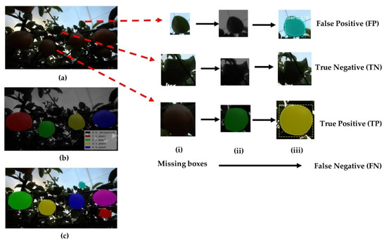 Pear prediction for determining FP, TN, TP, and FN using Mask R-CNN, (a) original image; (b) cv_mask input image before testing and (c) mask image after testing.