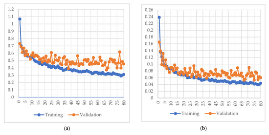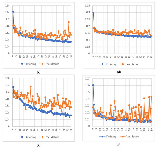 In this research, 9054 four-channel RGBA images (3018 images were original images and 6036 images were augmented images) in PNG format were used, and all images were taken by the same 3D stereo camera. The size of the validation set was adjusted by the loss function of the validation set. Initially, the training, validation, and testing sets were divided into a ratio of 6:3:1, that is, 5054 images for the training set, 2700 images for the validation set, and 900 images for the test set. The epoch was set to 80 with 500 steps in each epoch. During the experiment, since the Mask-RCNN could only use three-channel RGB images for the predicted images, the channels of the test set of 900 RBGA images were modified to RGB after the error was found. The following figures show the loss diagram of each partial function for this study (Figure 11a–f).