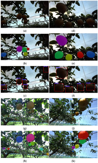 Results of Mask-R CNN in rotation angles. Recognition of (a–c): separated pear in low light; (d–f): aggregated pears in low light; (g–i): separated pears in strong light, and (j–l) aggregated pears in strong light (a,d,g,j) Original image; (b,e,h,k) Testing image in Mask R-CNN; and (c,f,i,l) Testing image in Faster R-CNN.