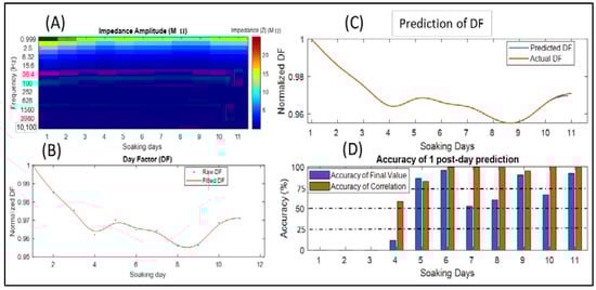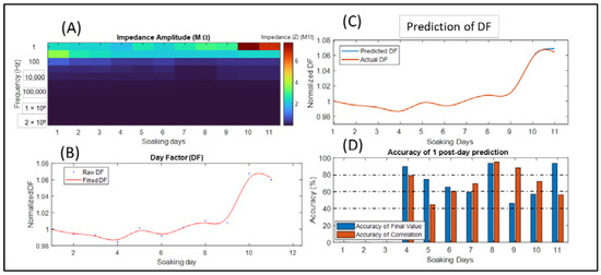 By implementing the DF formula using Equations (1) and (2), we obtained the DF signal (Figure 2B) that expressed the behavior of all frequencies during soaking days. The DF, or normalized DF, depicts the changes in the impedance by normalizing the DF of each soaking day to the DF of the first day. On day 6 (Figure 2A), we can notice a slight reduction in the impedance, where this change clearly occurred in the DF (Figure 2B). During the last two days, the impedance became higher, which affected the DF signal by increasing it too (Figure 2A,B).