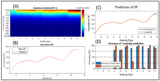Reduction and prediction of the impedance data in Microarray 3: (A) impedance value according to frequencies and soaking days; (B) approximated DF signal using the impedance in each soaking day, where the blue dots refer to the original DF values and the brown line to the fitted curve using splines; (C) actual DF with the predicted day 11 using the LSTM shown as the blue line; (D) accuracy of the final state AFS (brown) and the accuracy of the correlation coefficient ACC (blue) of each predicted soaking day starting from the fourth day.
