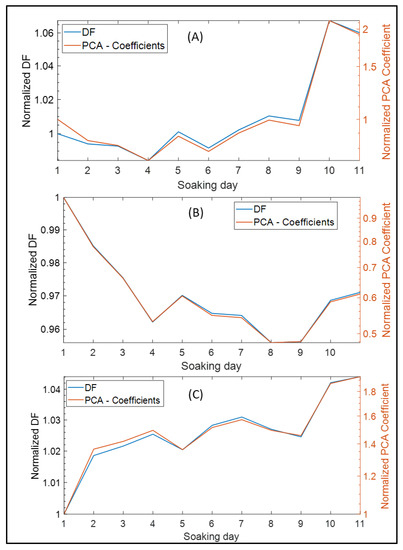 The normalized DF depicts the changes in the impedance, where on day 5 and 9 during soaking (Figure 4A), we can notice a slight reduction in the impedance, while this change clearly occurred in the DF (Figure 4B). The impedance increased during the last two days, which affected the DF signal by increasing it too (Figure 4A,B).