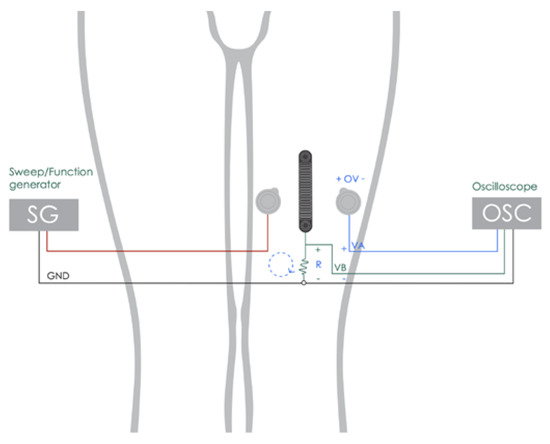 R = 1 kΩ, two pre-gelled Ag/AgCl electrodes, and the experimental electrode, for which we would like to determine the impedance in contact with the skin (