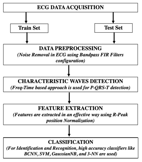 Figure 6 shows the pipeline for our system analysis, which was organised in the following order: ECG data acquisition, pre-processing, R-peak detection, feature extraction and, finally, classification for identity recognition.