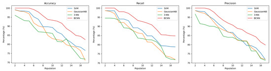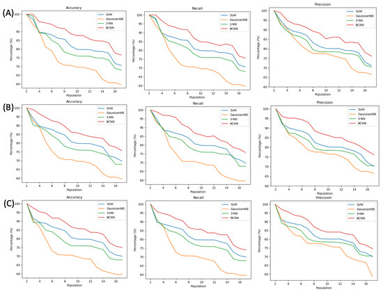 This ensures that the templates used for testing did not have the same temporal sequence as the randomly obtained ones, thus demonstrating that even if the morphology of the signal slightly changes, the classifier can still identify the subject. For both characterizations, the process was repeated 30 times so that the generalization ability of the algorithm could be more accurately evaluated. In addition, the performance of the classifier as a function of the number of subjects was analyzed. That is, the classifier was tested with templates for a number of subjects ranging from 2 to 17.