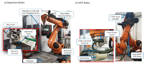 The automated robotic WAAM and NDE system depicted in Figure 1 was designed based on 2 × 6 Degrees of Freedom (DoF) industrial robotic manipulators (KUKA KR90 R3100) employed as a WAAM deposition robot and as an inspection robot. Additionally, as a part of the deposition robot, a horizontal rotary positioner (KUKA DKP-400V3) was also located within this cell and utilized as a rotational tooling mainframe and substrate clamping device. The deposition hardware, physically mounted on a deposition robot’s end-effector, featured a water-cooled plasma-arc welding torch (controlled by: EWM-TETRIX 552 AC/DC SYNERGIC PLASMA AW welder) integrated into a deposition device with a local shielding [28], as seen in Figure 1a. The local shielding device was an aluminum enclosure with multiple gas outlet channels fitted, that provided an additional supply of the argon shielding gas on a high-temperature WAAM to prevent atmospheric contamination that could result in oxidation of the fresh deposit. Further, a wire-feed outlet with adjustable height was fitted on the deposition device, positioned to supply feedstock into the melt pool. The wire supply was controlled by an automatic wire feeder (EWM T drive 4 Rob 3 Li, EWM) that was attached directly to the deposition robot’s arm as well. Lastly, the deposition head was equipped with a high dynamic range welding camera (Xiris XVC-1000) used to remotely assess the deposition quality.