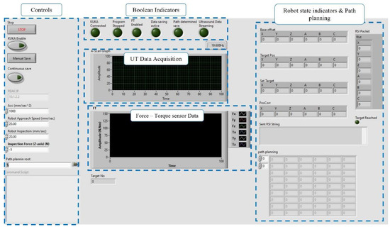 The NDE inspection was guided by a software platform developed in the LabVIEW programming environment [31], which offers reliable communication between instruments and fast prototyping, through several available toolboxes and libraries. The Graphic User Interface (GUI) is presented in Figure 3, where the platform consisted of parallel state machines responsible for executing the program in sequence, controlling the inspection robot kinematics through the FT sensor feedback and ultrasound data acquisition in real-time.