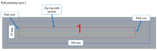 In this work, the deposition robot was controlled by a pre-installed PC with a WAAMCtrl (WAAM3D, Milton Keynes, UK) [29] application, streaming the deposition commands (robot paths, deposition parameters) directly to the deposition robot via RSI over an ethernet connection. The tool-path plan was generated using WAAMPlanner Software (WAAM3D, UK) [30], where the desired component was imported as a Computer-Aided Design (CAD), sliced into layers according to the pre-defined layer height, segmented into a set of individual building blocks from which the series of tool-paths was generated. Depending on the variables, such as material, geometry or deposition process, the deposition parameters were given to a WAAMPlanner and the post-processed file was generated, translating the information to a ready-to-stream xml file.