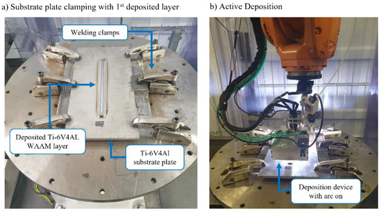 Figure 5a displays a deposition setup where an experimental wall was built on a Ti-6V-4AL substrate plate, 12.0 mm thick, clamped to the tooling which was mounted on a rotary table of the horizontal positioner. The plate was clamped using welding clamps to prevent bending caused by heat-induced residual stress [33], typical for arc-based manufacturing processes such as welding [34].