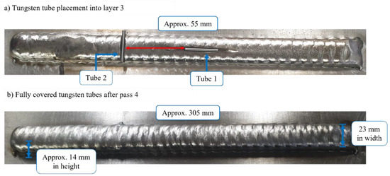To evaluate the NDE defect detection capability, artificial reflectors were embedded into the experimental wall. In this work, tungsten tubes with parameters specified in Table 2 were utilized for this purpose. Two tubes were embedded into layer 3 by producing slots using a portable grinding machine. The tubes were located approximately 55 mm from each other. Tube 1 was placed parallel to the wall, in the approximate centre of the bead. Tube 2, on the other hand, was embedded in the transverse direction to the wall as seen in Figure 6a.